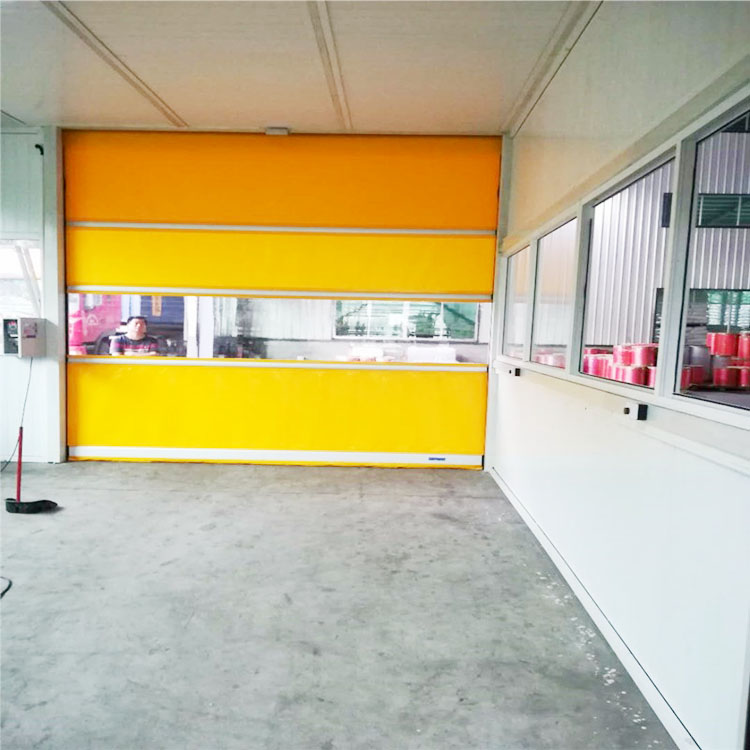 7.门帘—选用法国进口高强度工业织布,厚度0.9毫米,色彩主要有(黄、红、蓝、橙、透明等),中间加装透明视窗,使人员车辆出入更安全,具有高抗拉强度,高抗穿刺性能,适用于频繁开启,高速运转,外置铝合金肋条,增加抗风效果;